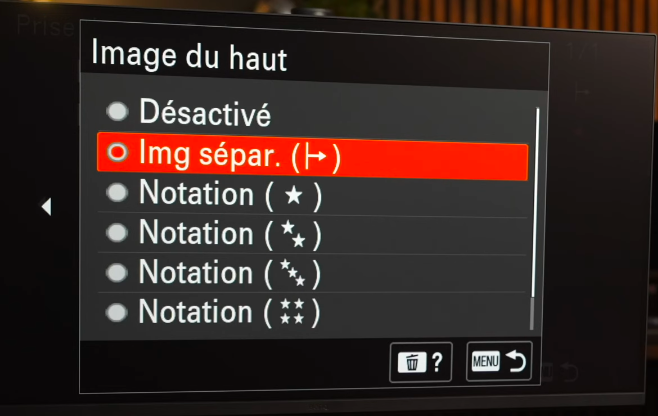 Ce réglage ne plaira pas à tout le monde, mais moi je l’aime bien ! C’est une nouvelle option qu’on trouve dans l’onglet 12 du menu rouge “option prise de vue” puis “sélection/mémo p.v.”.