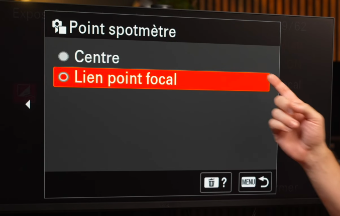 Dans le menu rose, onglet n°3 Mesure, vous trouverez l’option point spotmètre. Sélectionnez « lien point focal« .